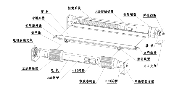 1、每套系统使用一台50系列的管状电机和一个弹簧系统;